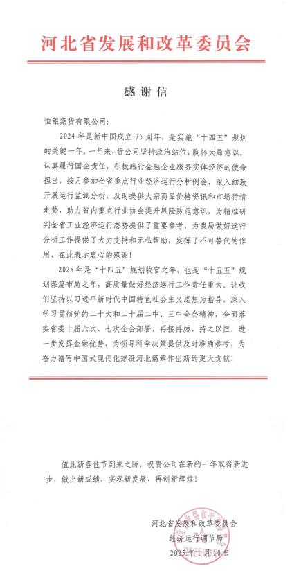 近日,河北省發(fā)展和改革委員會(huì)經(jīng)濟(jì)運(yùn)行調(diào)節(jié)局向恒銀期貨發(fā)來感謝信。信中對(duì)恒銀期貨踐行國(guó)有金融企業(yè)服務(wù)實(shí)體經(jīng)濟(jì)的使命擔(dān)當(dāng)、深入細(xì)致開展運(yùn)行監(jiān)測(cè)分析、及時(shí)提供大宗商品價(jià)格資訊和市場(chǎng)行情走勢(shì)、助力省內(nèi)重點(diǎn)行業(yè)協(xié)會(huì)提升風(fēng)險(xiǎn)防范意識(shí)、協(xié)助研判全省工業(yè)經(jīng)濟(jì)運(yùn)行態(tài)勢(shì)等工作表示感謝,并對(duì)恒銀期貨2025年工作提出了期望和要求。